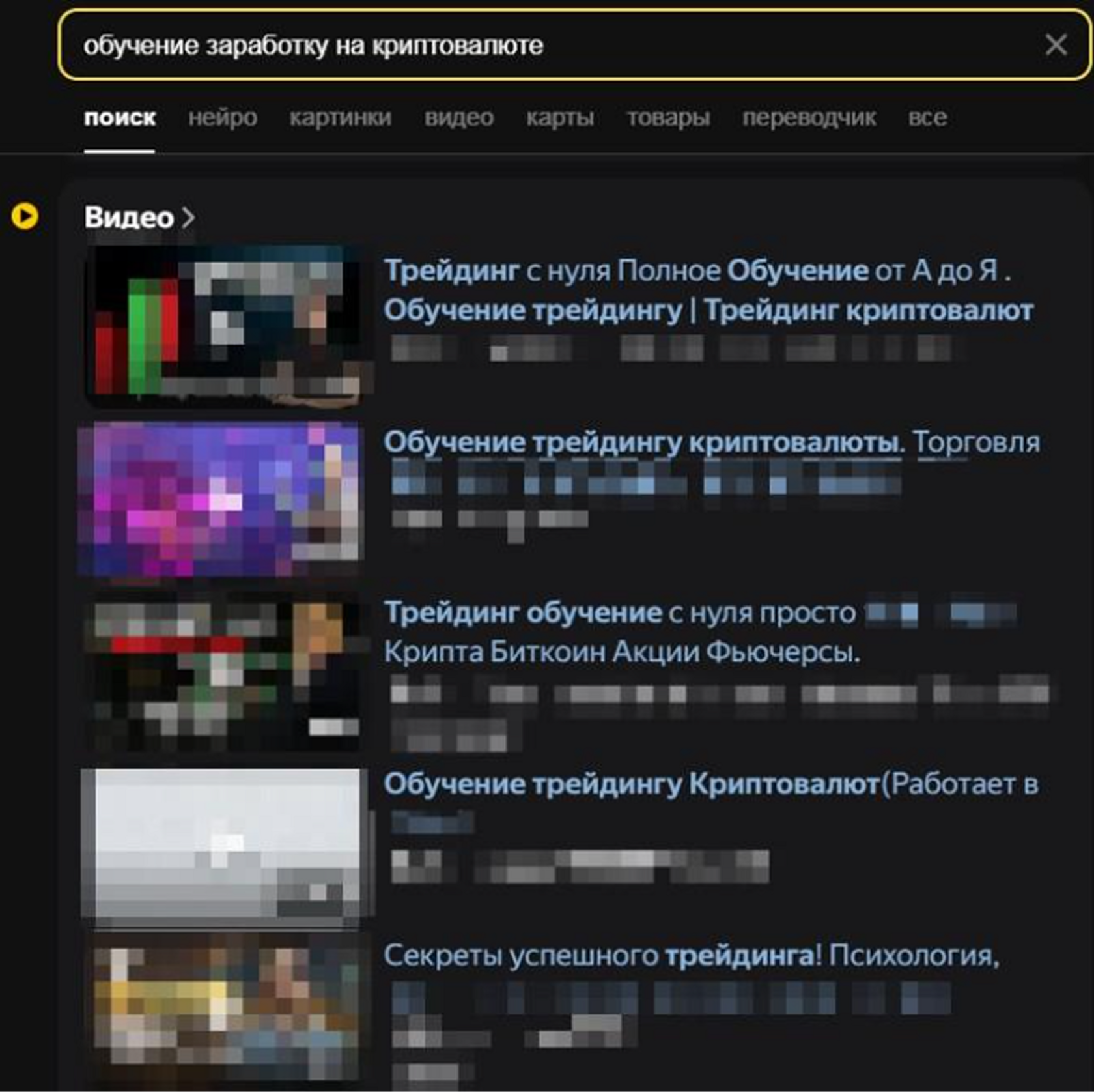 Вот наглядный пример. Запрос в браузере «Обучение заработку на криптовалюте» выдает кучу статей и видеороликов по трейдингу. Еще раз,